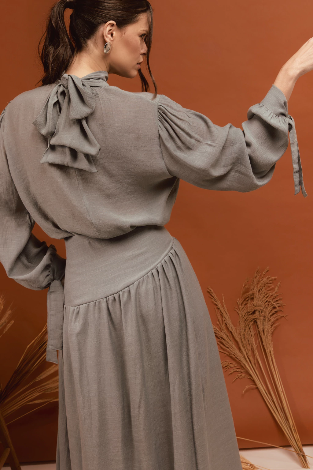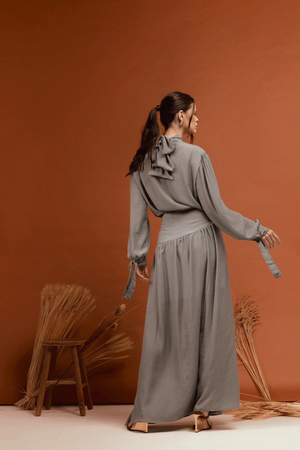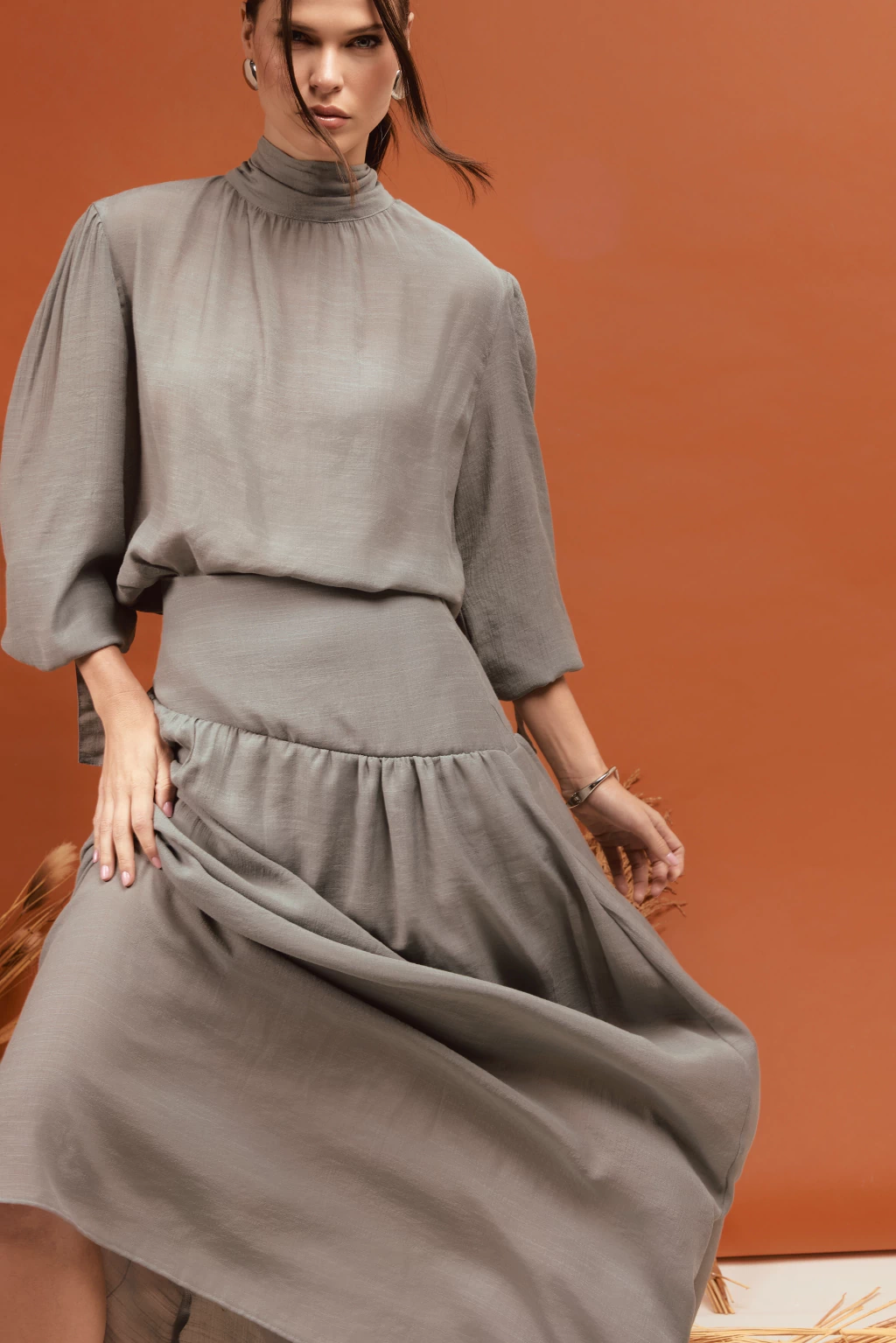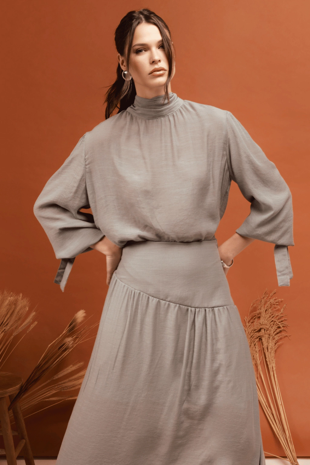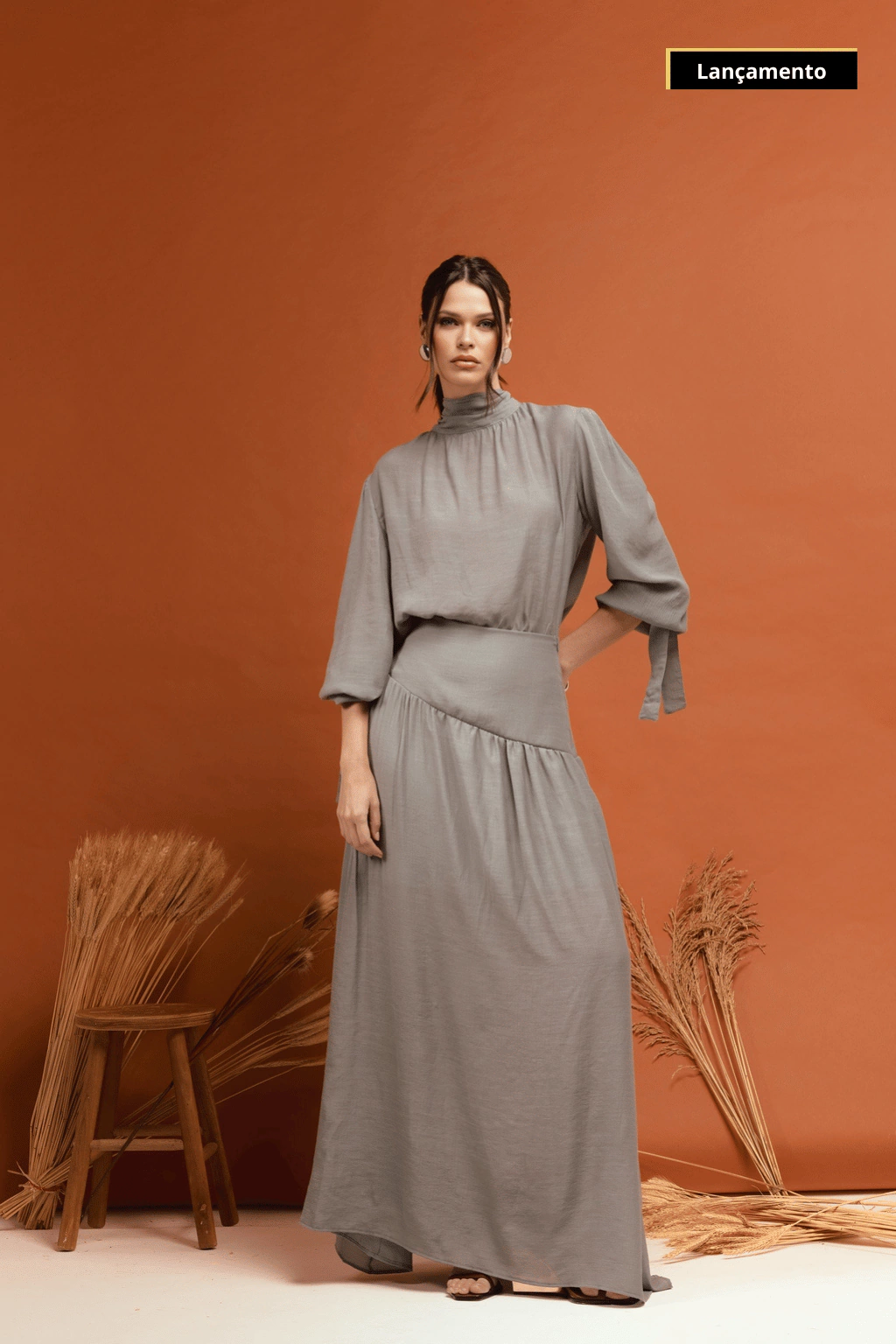 Experimente o sofisticado e confortável Conjunto Kiraz Artsy Cinza, ideal para quem deseja um visual moderno e elegante. Composto por uma blusa de gola alta com mangas bufantes e amplas, além de uma saia longa ampla com zíper lateral e forro, este conjunto é confeccionado em malha crep, com uma composição de 55% poliéster e 45% elastano, garantindo um caimento perfeito.