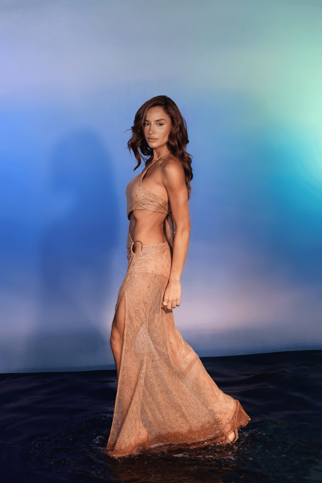 Encante-se com o Vestido Samia Bronze! Com modelagem justa, este vestido longo em arrastão paetê destaca-se pelos recortes estratégicos e detalhes de argola em metal, garantindo um visual moderno e sofisticado.